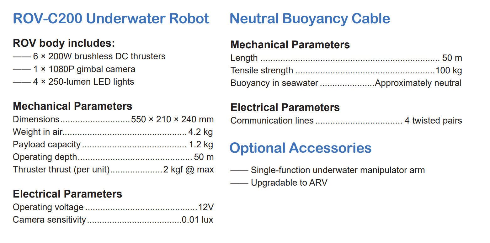 Compared with the C-100, the C200 adds one vertical thruster and one lateral thruster, increasing yaw and lateral movement degrees of freedom. The three vertical thrusters provide better dynamic stability, enabling the robot to maintain a stable posture in water, even when its center of gravity shifts after grabbing underwa- ter objects with the manipulator arm. The added lateral thruster grants the robot lateral movement capability, enhancing its maneuverability and allowing for more precise operations. Together with the C100, the C200 offers a tiered product lineup, giving students a wider range of options.